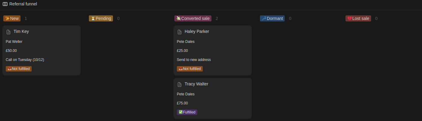 A drag and drop ‘kanban’ style board, where you can track individual referrals through the referral process.